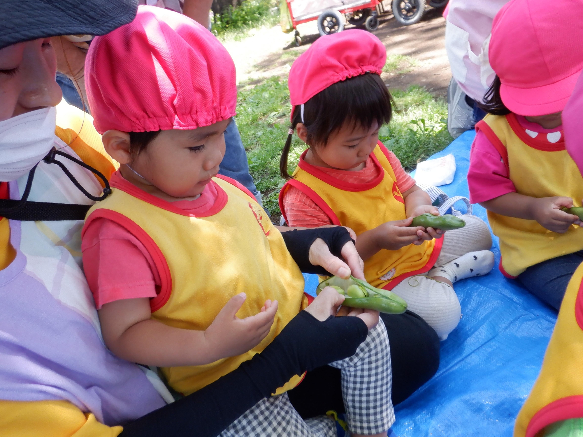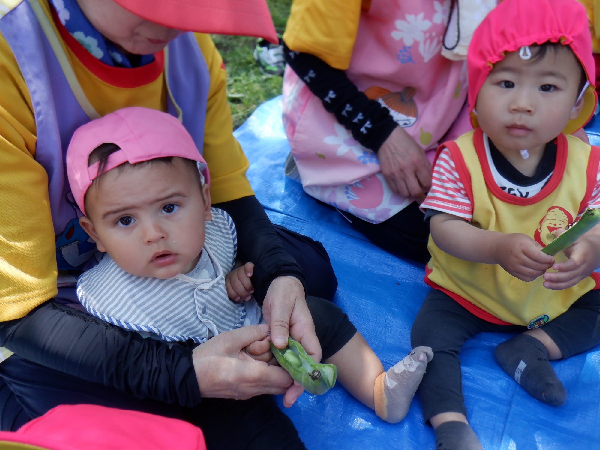 青空保育&そら豆さやむき体験をしました。